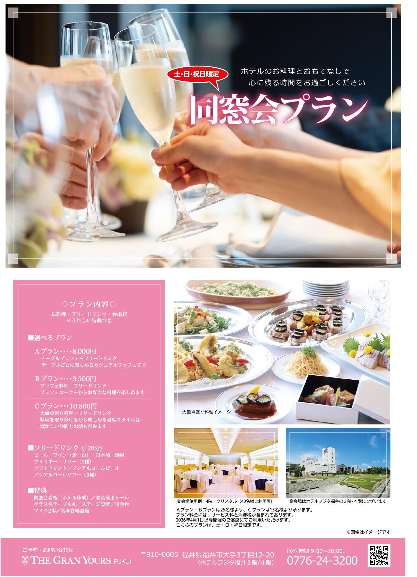 同窓会・クラス会・同期会など懐かしい仲間と、心に残る時間をゆっくりとお過ごしください。
